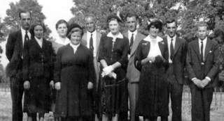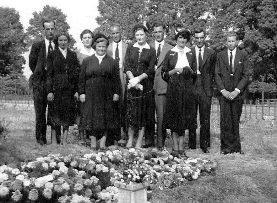 Lucy Locke's funeral, Kingweston 1955. (l-r) Henry & Doreen Locke, Mary (Locke), Pam (wife of Stan), Stan Locke, Doris and Albert Locke, Queenie (Locke), Arthur Locke, Arthur Groves.