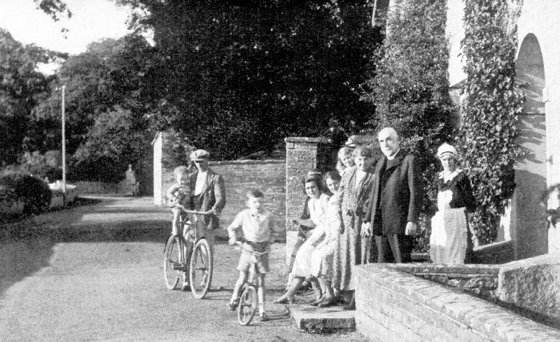 1931. Mathwin Maunder, Tom Look, Derek Maunder, Miss Davies, Mrs. Maunder, Brenda Maunder, Mrs. Day, Rev. Edwin Day and Rose Look. The group stand outside the Rectory.